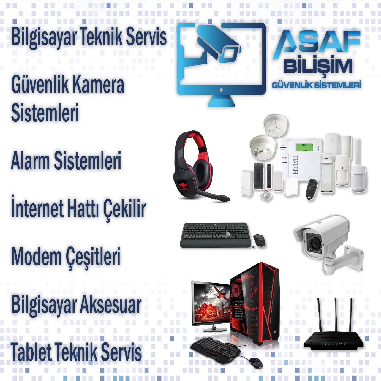 Asaf Bilişim Güvenlik Sistemleri olarak Güvenlik Kamerası,internet alt yapısı(Fiber,Bakır),Çanak Anten,Kablosuz Alarm Sistemleri,Görüntülü Diafon alanında Hizmet Vermekteyiz. Siz değerli Müşterilerimize Hizmet etmekten Mutluluk Duyarız